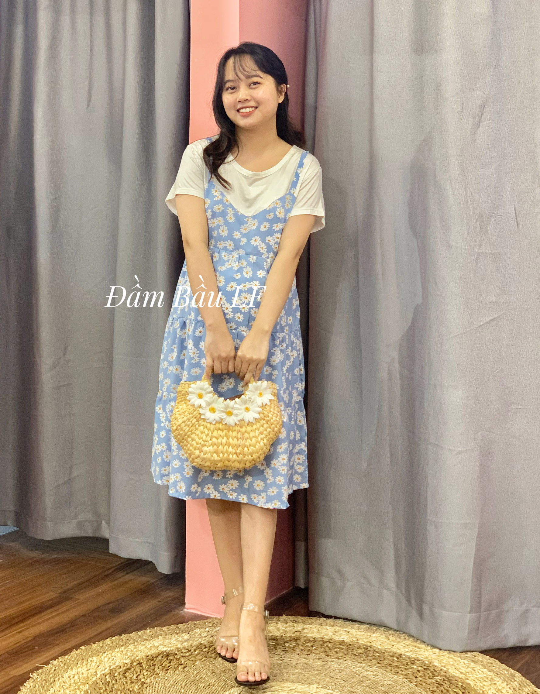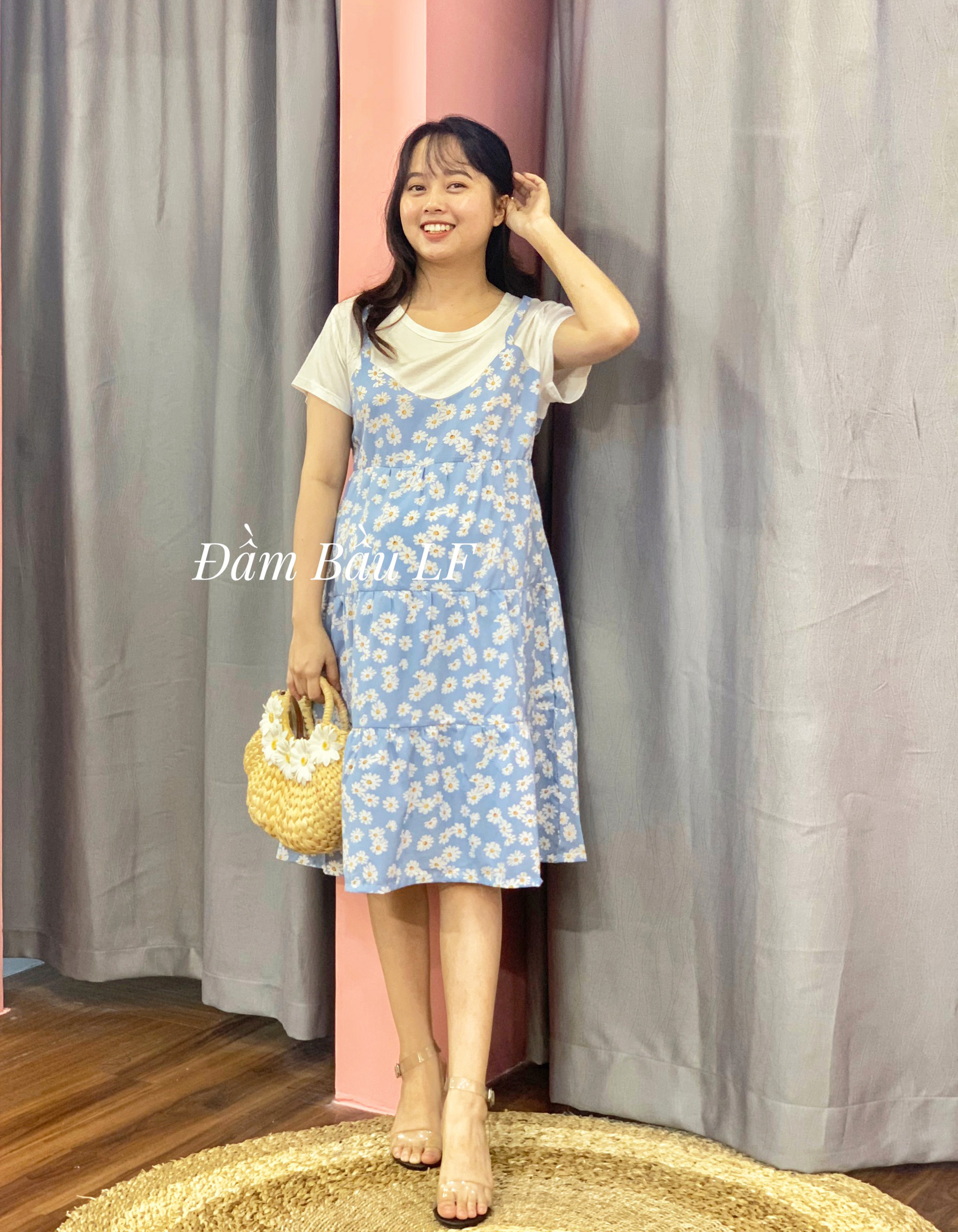 Đầm bầu đẹp thời trang được thiết kế với màu sắc tươi sáng và trẻ trung, họa tiết hoa mát mẻ.
